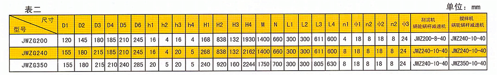 蝸輪蝸桿減速機規(guī)格主要有JWZ200\JWZ2410\JWZ350\JWZ460等,根據(jù)澄清池大小選擇合適的蝸輪箱。以下數(shù)據(jù)僅供參考: