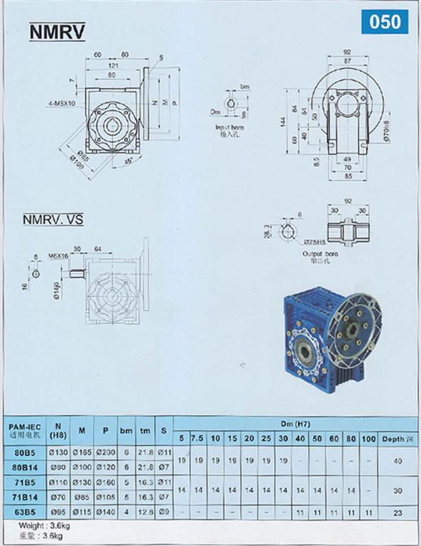 NMRV-RV50蝸輪蝸桿減速機中心距50毫米,鋁合金外殼。傳動平穩,噪音低,傳動比大。