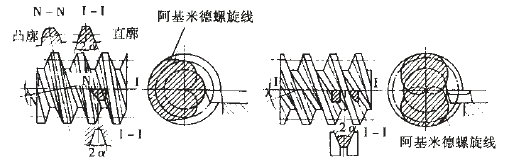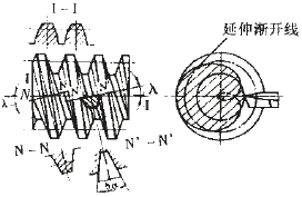 圖1所示為幾種蝸桿的車(chē)削方法,其中圖(a)、(c)所示為阿基米德(ZA)蝸桿和漸開(kāi)線(xiàn)(ZI)蝸桿。當(dāng)蝸桿的頭數(shù)增多、導(dǎo)程角增大時(shí),其幾何形狀和切削角度將出現(xiàn)加工困難。圖(b)所示為一種延伸漸開(kāi)線(xiàn)蝸桿,又稱(chēng)齒槽法向直廓(ZN